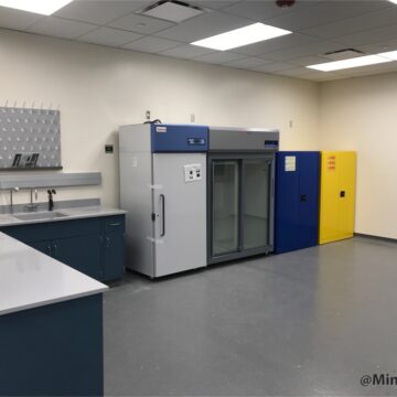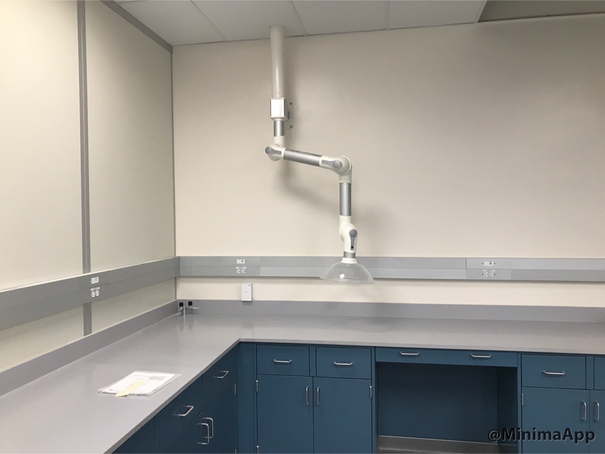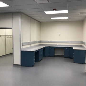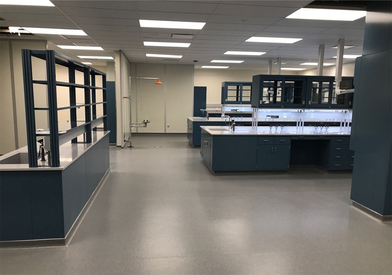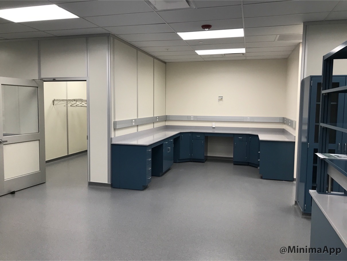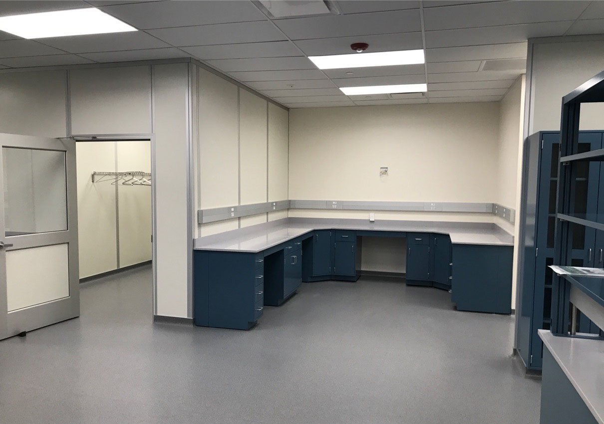 2,600 SF build out of a shell space for a chemical laboratory including ante room and cascading room pressures, eye wash, shower, sewer, separate piping system for waste treatment, gas piping, RO/DI Loop, chemical exhaust systems, increased structural, laboratory casework, 1 custom fume room with tri-fold automatic sliding doors, 1 ISO class 6 manufactured fume hood epoxy tops and flooring, new controls, humidification and air handing equipment.
